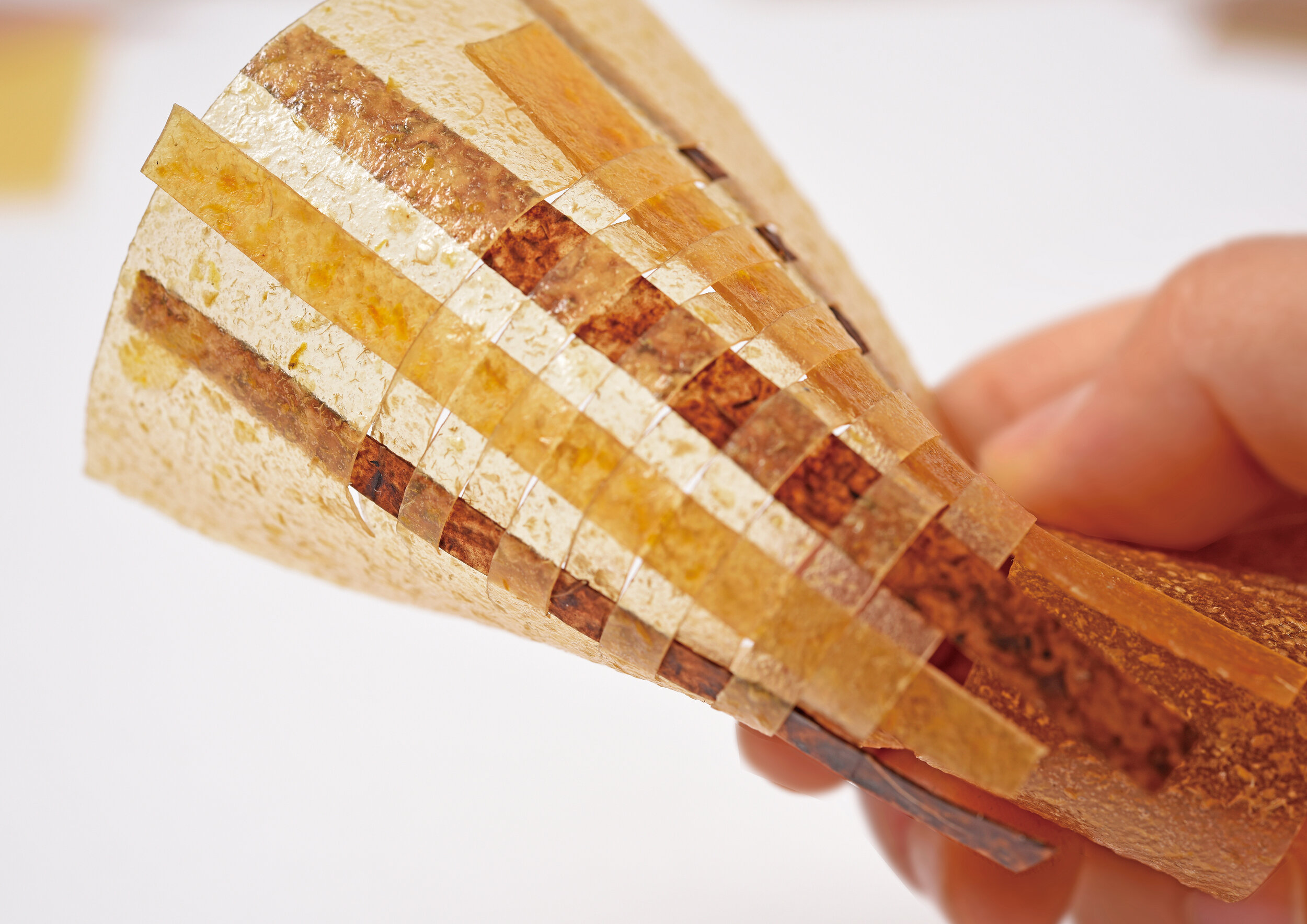 The team currently works together with industry experts towards a translation to mass production. The aim is to provide a holistic material platform and sustainable solution to designers and brands and to set a trend of transforming the conventional textile industry into an innovative sustainable biomaterial industry. Material sheets of various colors and shapes as well as several products e.g. a lasercut hat made of fruit waste, will be on show during Sorry we are Trying. Biomaterials in Practice.